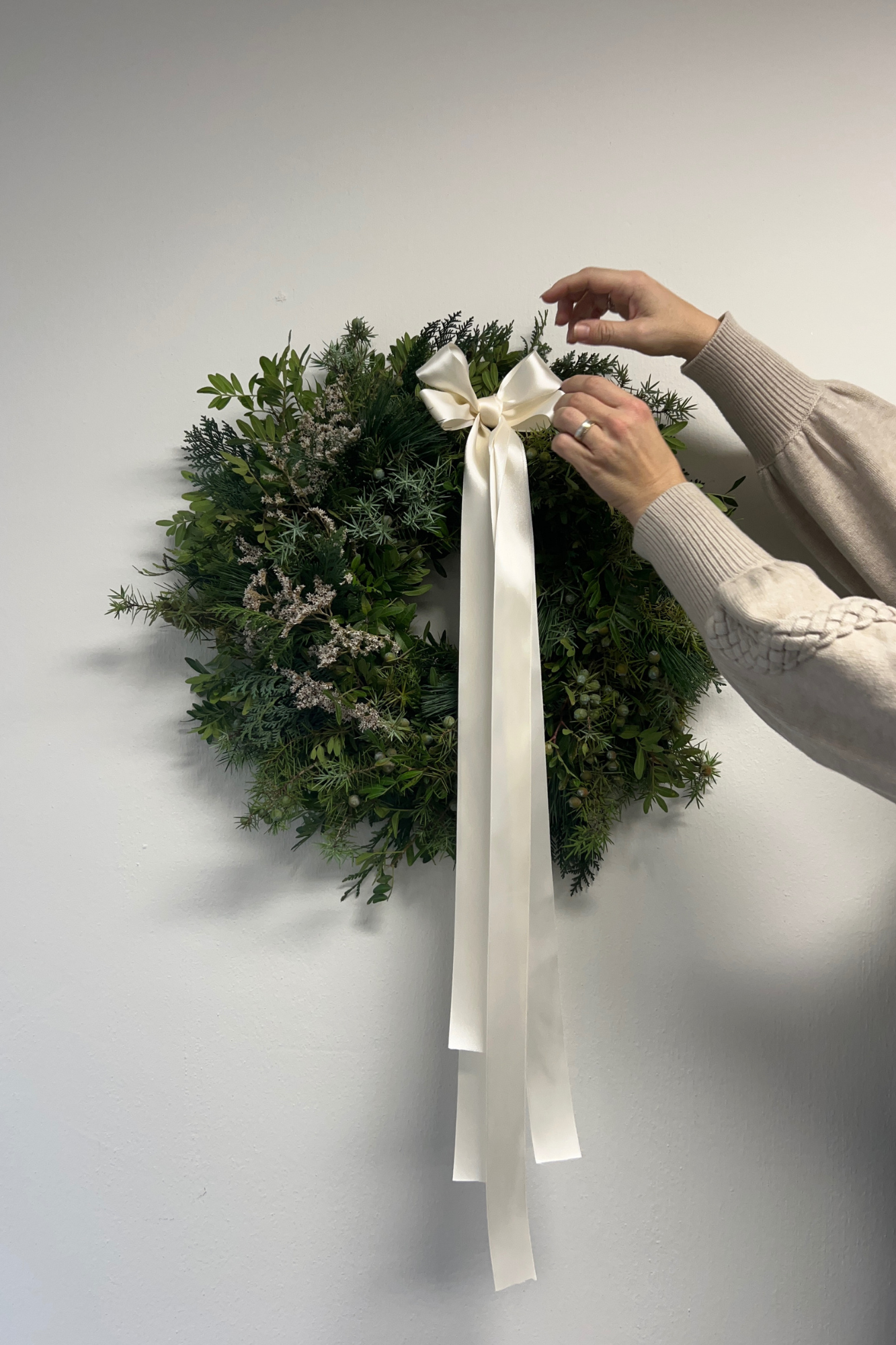 Zur Verfügung stehen dir viele wunderschöne Materialien: Nadelgehölze, Schnittgrün, Zapfen, kleine Baumkugeln und weitere stilvolle Dekorationen. Als besonderes Extra kannst du deine Kreation mit einer trendigen Schlaufe nach deinem Geschmack abrunden.